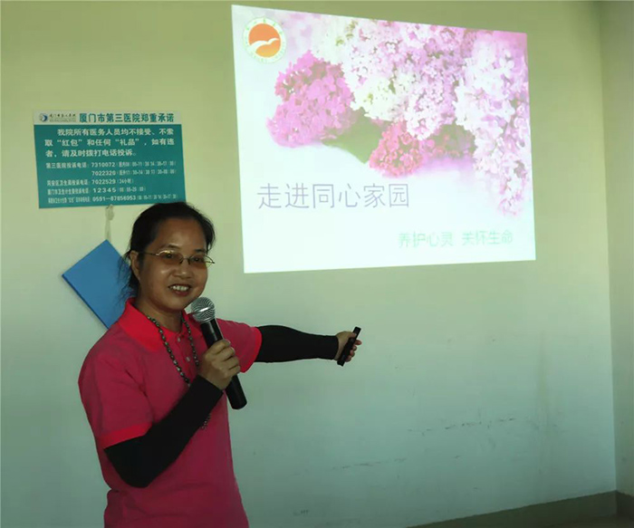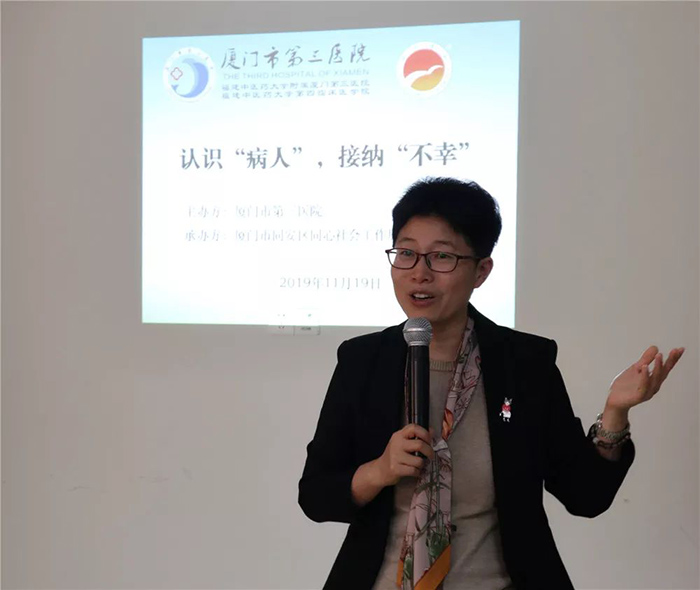 11月19日下午,医院邀请了同安区委文明办未成年人心理健康辅导站负责人、国家二级心理咨询师、国家高级心理督导师杨金平来到三院康复医学科,为广大患者及家属带来题为《认识“病人”,接纳“不幸”》的分享交流,杨金平老师从自身经历、身边鲜活的实例来开导患者,鼓励患者及家属保持乐观心态,积极配合治疗。