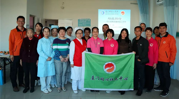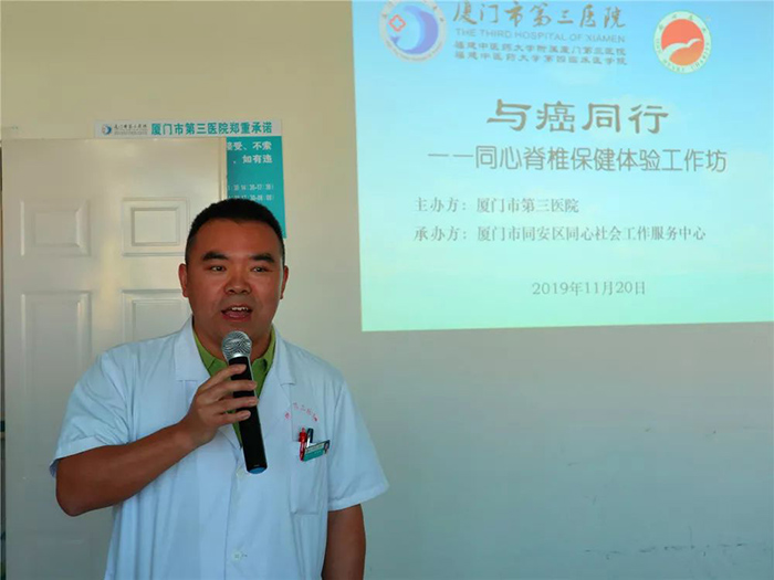 11月20日下午,“与癌同行——同心脊椎保健体验工作坊”分享交流会在三院肿瘤科举行。同心社工们除了分享各自抗癌的故事,用生命影响生命的方式提高病人对自己的康复的信心外,还现场教大家做脊椎保健,让癌友患者放松心情,体会生活的美好。针对个别悲观的病人,社工们还亲自到病房与病人交流,引导患者及家属积极转化负面情绪,突破恐惧和害怕,勇敢去面对疾病,树立治疗信心。