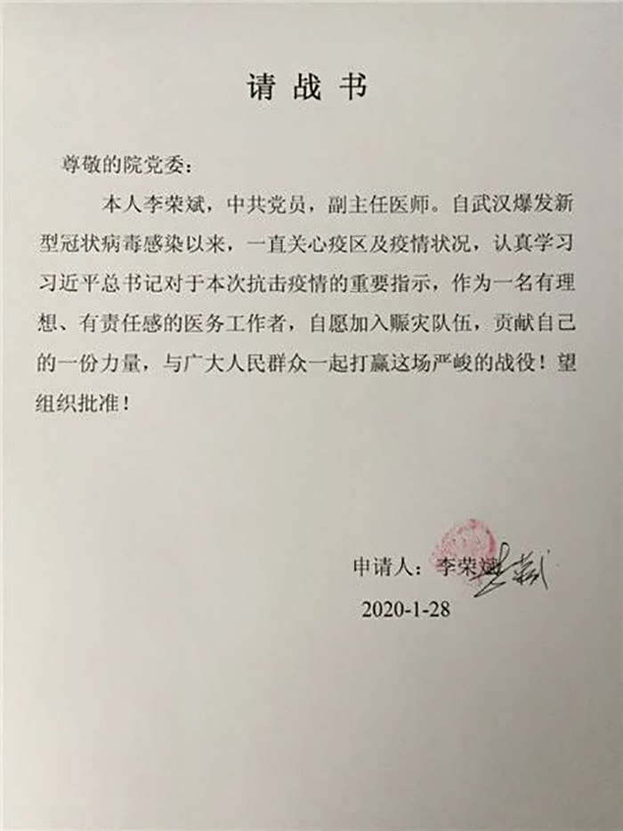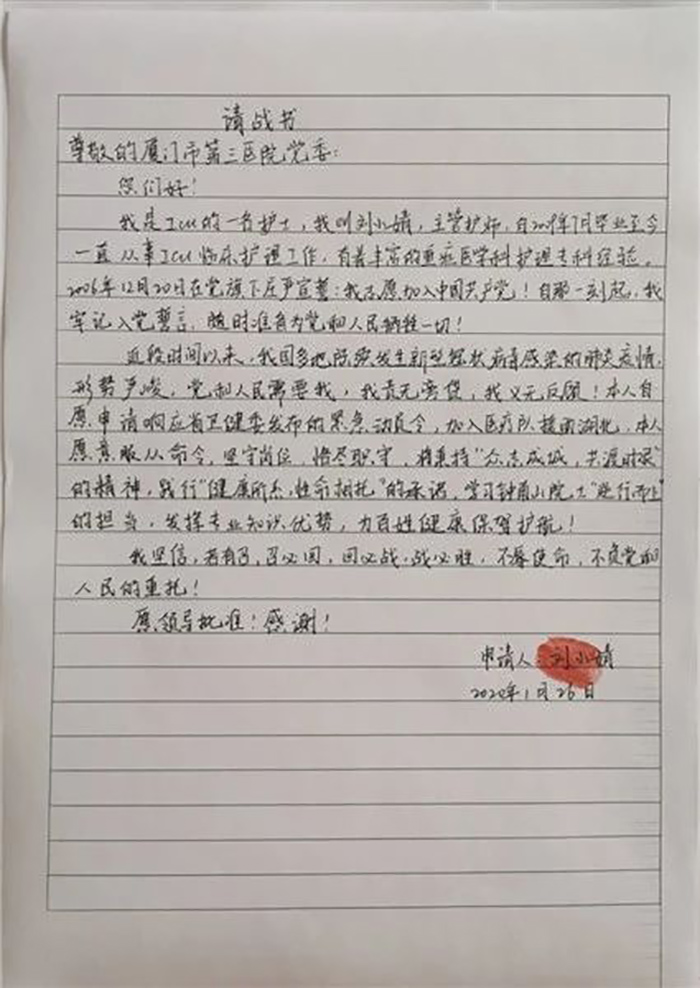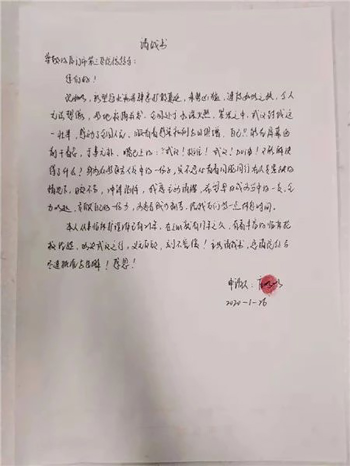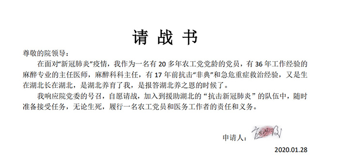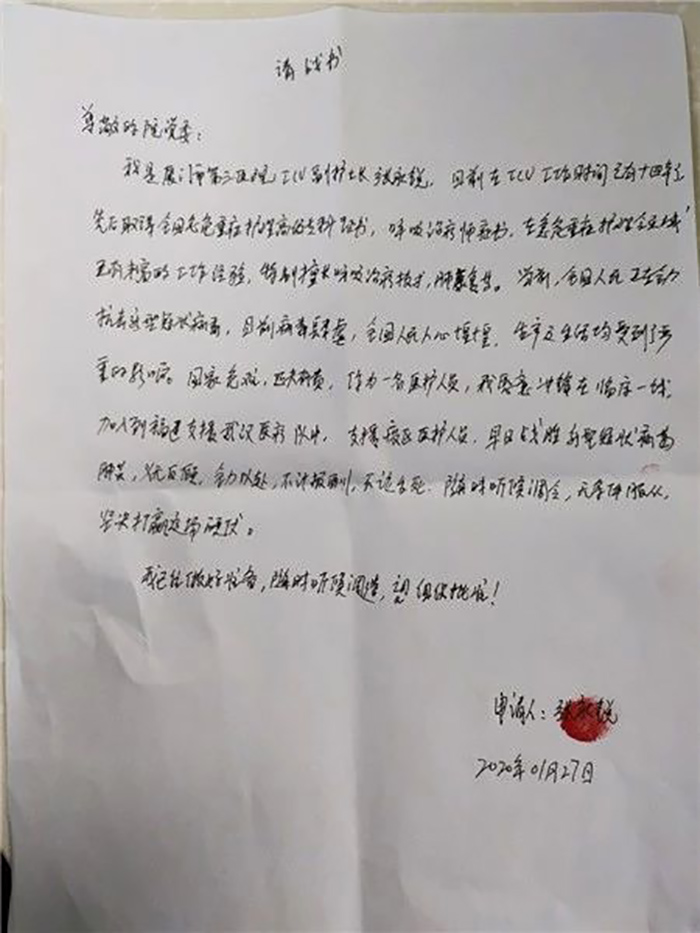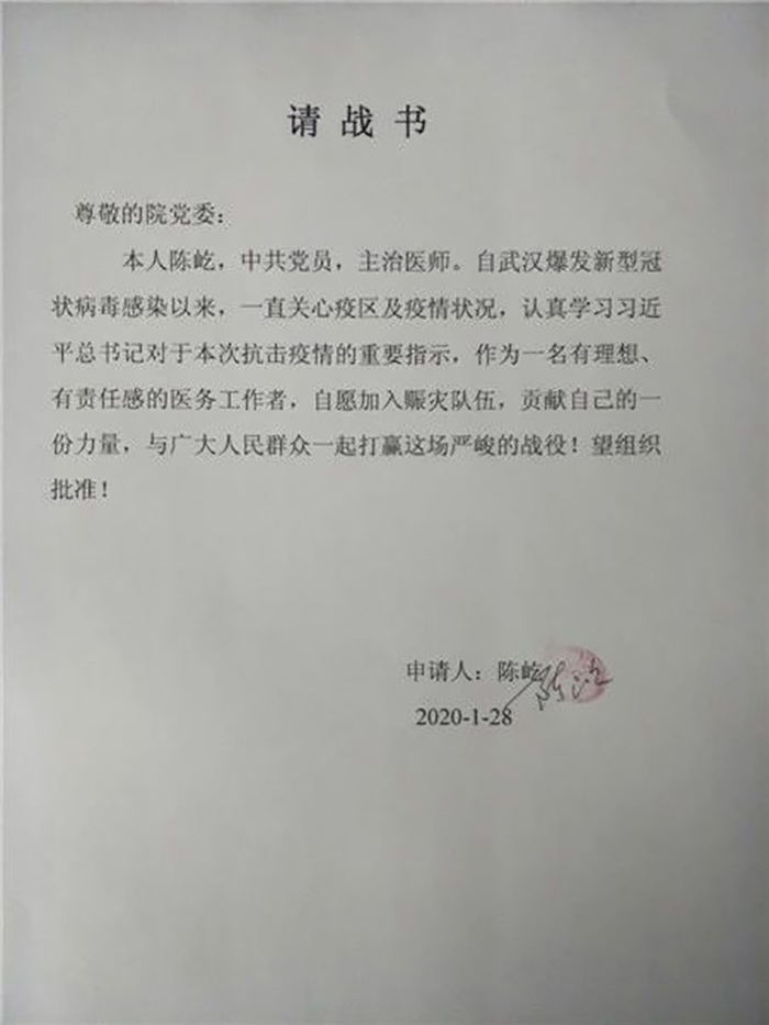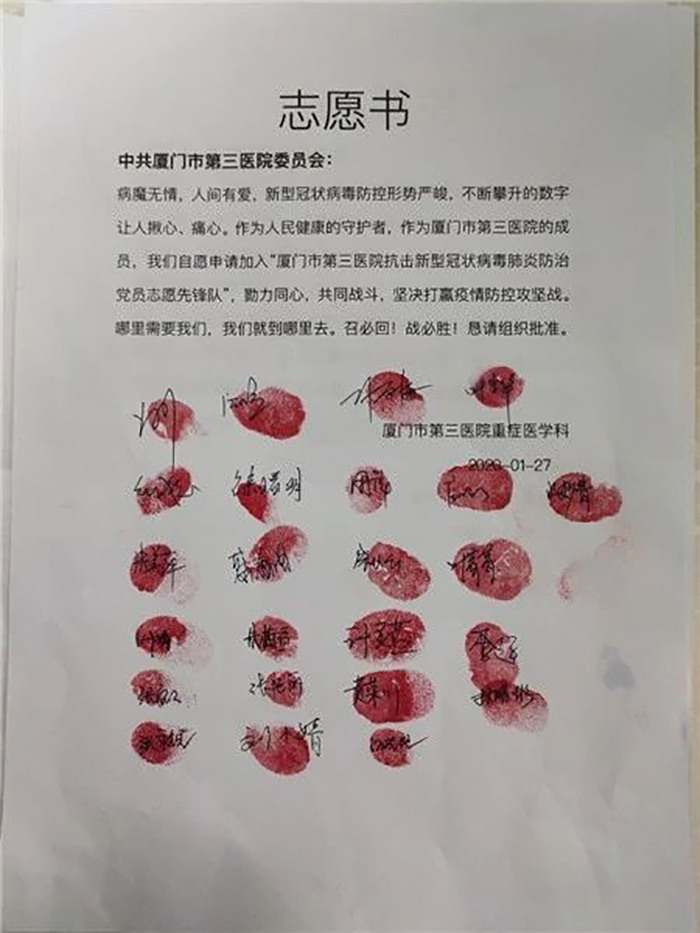 抗击新型冠状病毒肺炎防治党员先锋队”。 其实,孙竞群的母亲在不久之前刚做完动脉瘤介入手术,目前在家休养,妻子怀二胎也即将临盆,但家人仍支持他报名。“大宝懂事,也请了保姆,家里边的亲戚也能帮衬着,”孙竞群说,“救死扶伤是使命,希望能够前往武汉抗击疫情。” 一封封**书, 一个个鲜红的手印, 充分体现了三院党员、医护人员 在疫情面前众志成城、勠力同心、 共克时艰的战斗精神和医者情怀! 呼吸内科主治医师:张先锋 “我是一名医生,面对疫情,随时投入防控工作责无旁贷!”张先锋是91club