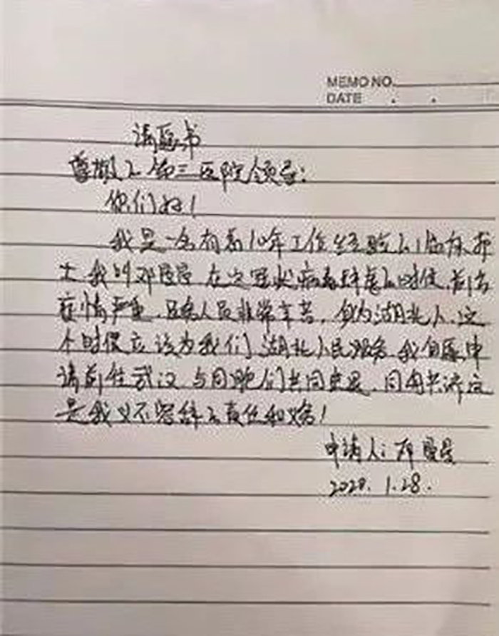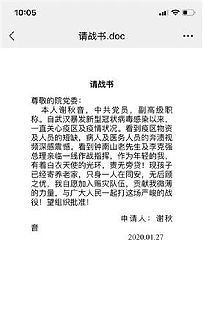 呼吸内科主治医师,擅长呼吸危重症诊治、纤维支气管镜的介入治疗,在三院有丰富的临床经验和防控治疗传染性疾病的经验,在看到院党委发出的倡议书后,他第一时间报名,要求加入到医疗救治队伍中。 其实,武汉对于张先锋而言,也是第二故乡。2004年7月,张先锋毕业于武汉大学临床医学专业,如今武汉疫情形势严峻,他希望这个时候的自己能够为武汉打赢疫情防控阻击战略尽绵薄之力,“家人很是支持我报名,我时刻准备好向武汉出发。” 重症医学科副护士长:张永锐 张永锐目前在ICU工作也有十四年,先后取得全国急危重症护理高级专科证书、呼吸治疗师证书,在危急重症护理领域有丰富的工作经验,特别擅长呼吸治疗技术、肺康复等。他表示,希望能够加入到福建支援武汉医疗队中,不计报酬,全力以赴,随时听候调令,坚决打赢这场硬战。 重症医学科(ICU)护士:庄吟吟 “好几次看到前方报道,默默流泪,一点微薄力量,请战!”重症医学科护士庄吟吟第一时间通过微信,向护士长周萍报名,随后利用休息时间写了请战书。 庄吟吟说,自己从事临床护理已有21年,其中在 ICU就有17年之久,有着丰富的临床护理经验。她说,自己不忍心看着同胞同行在人员紧缺的情况下,日夜不分,冲锋陷阵,希望在这个时候能贡献自己的一份力,“让患者减少痛苦,给同行的医护人员多一点休息时间。” 庄吟吟的心思,家里人看得很是透彻。“她心系武汉,我们支持她的决定,”庄吟吟的家人说,他们也希望庄吟吟能在救治病人的同时,保护好自己和同事。 医学检验科副主任:林燕平 “我报名去武汉,行李也收拾好了。”检验科副主任林燕平,病人多,检查的项目就多,这项工作总需要有人做,爱人和儿子支持她报名支援武汉,她愿发挥专业知识优势,到疫情一线做一名检验“侦察兵”。 呼吸二科护士长:夏爱芳 夏爱芳是湖北人,爱人是一名部队医生,大儿子今年16岁,二宝现在2岁,她认为,自己身为湖北人有义务也有责任在关键时候报名前往武汉抗击肺炎疫情。“妈妈,你去吧,我一定会帮爸爸照顾好弟弟的。”家人对夏爱芳的决定表示支持,大儿子自信而坚定的的话语让夏爱芳更加义无反顾。 感染科: 从疫情爆发,身为专家组成员的感染科主任马龙,就驻守医院,积极参与新型冠状病毒肺炎的诊断救治工作,尽管膝关节疼痛肿胀,但他都没有停下休息的步伐,一直坚守在临床一线,至今已连续一个星期没有回到家中,更别提与家人相聚围炉。 马龙说,我们感染科的医务人员一直心系着疫区人民,对疫区群众的遭遇深感同情,科室全体人员都有一种前去救援的冲动。,全科人员主动请缨,向医院党委提出申请,强烈要求奔赴一线疫区参与病毒阻击战。我们也将竭尽全力、不辱使命,为捍卫人民群众的健康尽力。 妇产科: 生命重于泰山,疫情就是命令,防控就是责任。在做好本职工作的同时,院党委委员、妇产科主任徐彩临率科室全体党员、科主任、护士长及全体男医生郑重向院领导提出申请加入抗“新型冠状病毒的肺炎疫情”战斗中去,我们随时听候调遣。 内分泌科: “一方有难,八方支援。”内分泌科科主任高允盛将倡议书发到工作群后,陈德梅、陈明智、汪伟、周密、吴丽青等科室15名医护人员纷纷报名,“哪里需要我们,我们就到哪里去。” 还有很多医护人员通过微信报名, 言语虽短, 但写出了三院医者的仁心与担当, 其中包含的不仅是始终坚守的职责, 更有逆风前行的无畏。