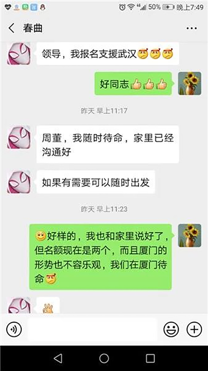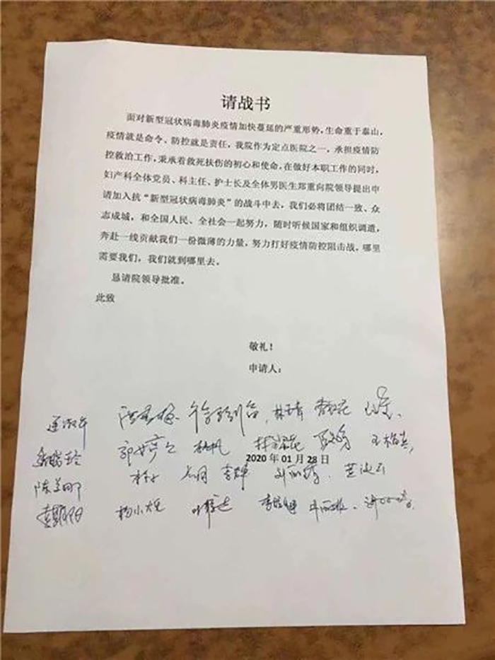 关于抗击新型冠状病毒感染肺炎疫情的倡议书》,医院各支部的党员干部医护人员,纷纷报名加入党员先锋队,发挥党员先锋模范作用,比如党员干部ICU主任吴彬、护士刘小婧;感染科护士陈惠娜;呼吸一科主任孙志强、护士陈密真;超声影像科副主任李荣斌、陈屹;急诊科主任王建;骨科主任医师孙竞群等均主动请缨,报名参与到抗击肺炎的战斗中去。临床一线医护人员,感染科主任马龙;呼吸二科主任卢晔;呼吸一科主治医师张先锋、护士黄亚红;呼吸二科护士长夏爱芳、护士陈艺芳;ICU主治医师吴资瑶,副护士长张永锐、护士庄吟吟;医学检验科副主任林燕平等,也都主动报名。