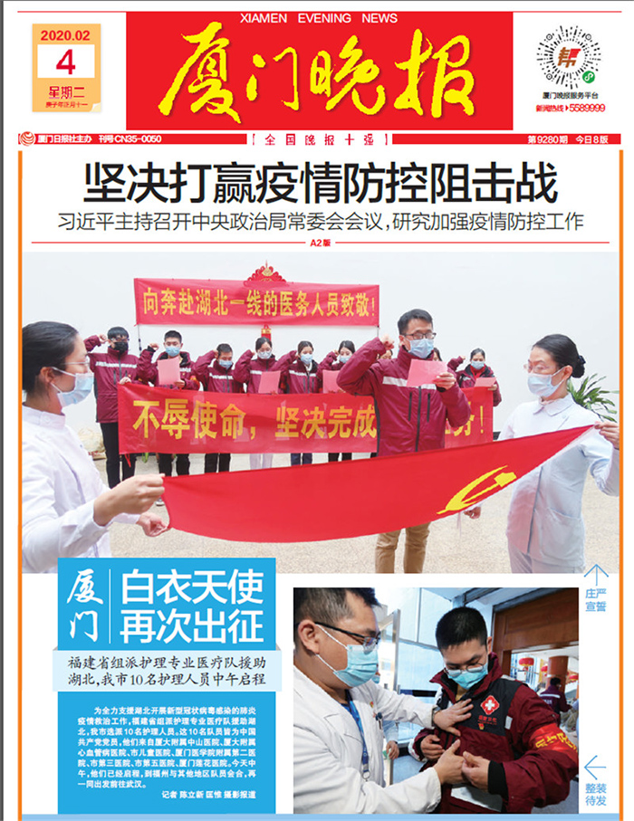 相关链接 据厦门晚报报道:此次为全力支援湖北开展新型冠状病毒感染的肺炎疫情救治工作,福建省组派护理专业医疗队援助湖北,我市选派10名护理人员。这10名队员皆为中国共产党党员,他们来自厦大附属中山医院、厦大附属心血管病医院、市儿童医院、厦门医学院附属第二医院、市第三医院、市第五医院、厦门莲花医院。今天中午启程,到福州与其他地区队员会合,再一同出发前往武汉。