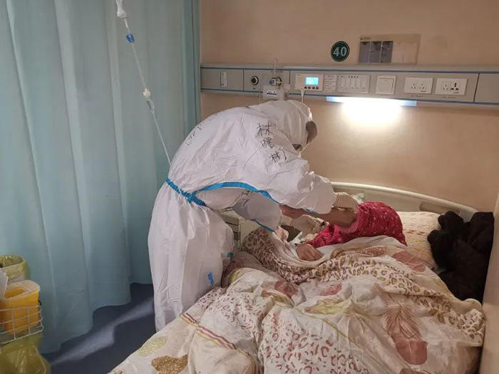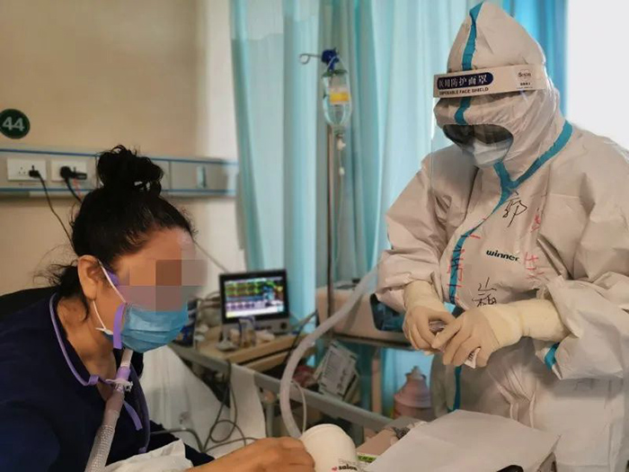 李丽青主管的一位重症患者,患有重症糖尿病、失明,而且还有轻微的认知障碍,生活完全无法自理。因病区不允许家属陪护,除了密切监测生命体征、完成各项诊疗,还需细心喂食、更换尿布、加强翻身等护理。平常简单的护理工作,在层层防护服的包裹下,却显得那样的艰难。因患者患有轻度认知障碍且没有家属陪伴下,时常会出现烦躁、拒绝配合的行为。李丽青不但没有抱怨,而且更加耐心、轻声细语地安慰着患者,不仅注重患者身体上的治疗护理,还关注患者心理活动,经常鼓励病人,为他加油打气,走进病人心理,真心帮助,让他们感受到温暖和希望,更好促进他们身心康复。