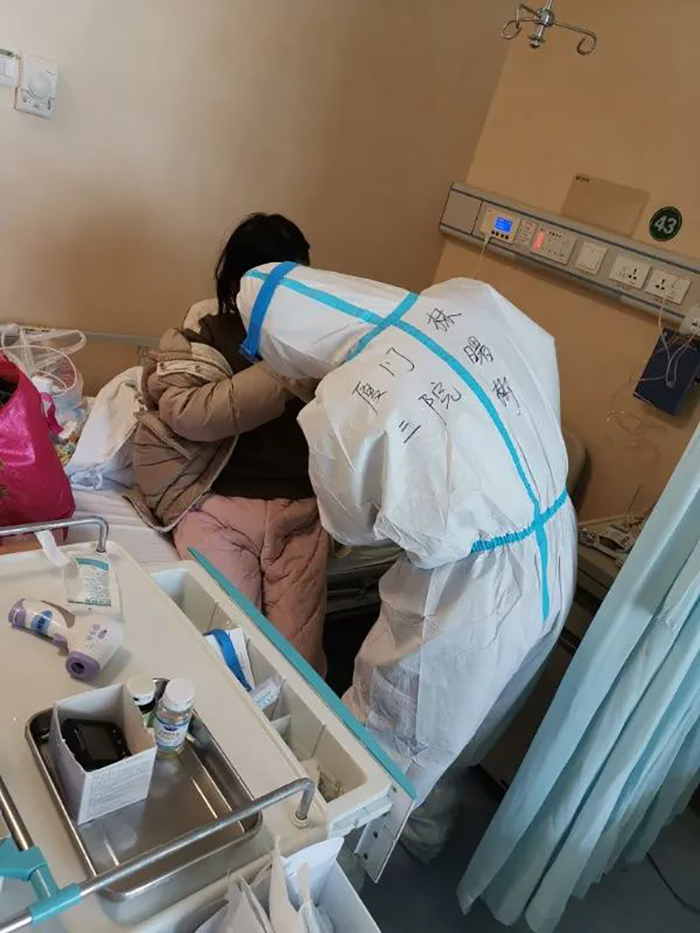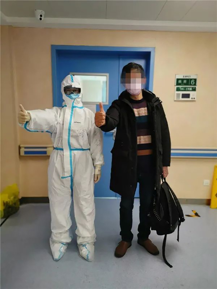 经过一天的岗前培训后,2月10日晚厦门医疗队入驻接管武汉同济医院光谷院区中的两个重症病区,吴奕群依照排班计划站上第一岗,当晚即与上级医师夜查房,与病毒作斗争,与死神拼速度,全力救治每一例患者。2月18日,厦门援鄂医疗二队所接管的重症病区有两例患者治愈出院,其中一位病人就是吴奕群所在医疗小组救治的。这是该病区成立以来的首例出院,对病区其他的病人也是极大的鼓舞。一位大爷经过10天的精心治疗与护理,病情好转许多,闻悉此消息对吴奕群竖起大拇指点赞。