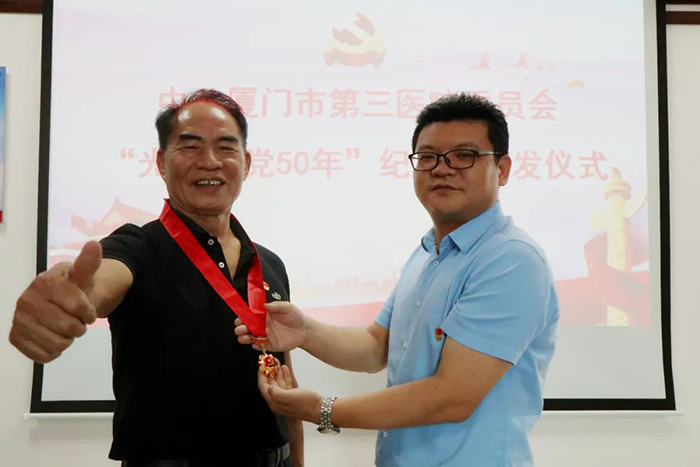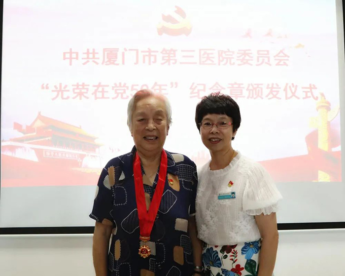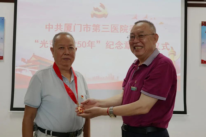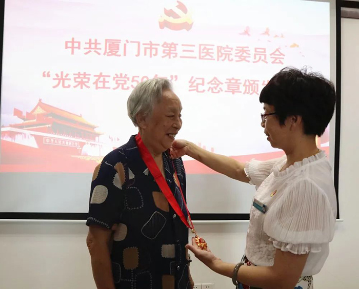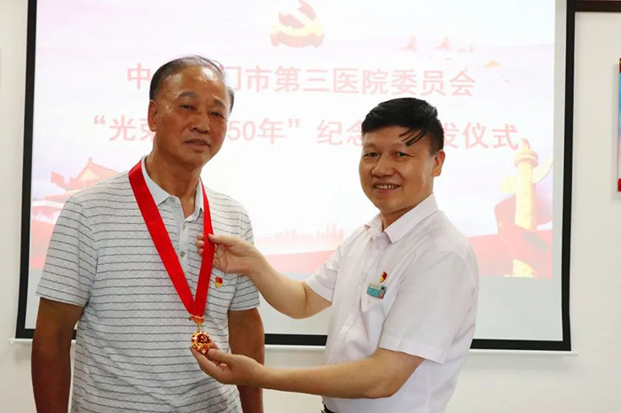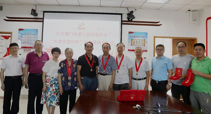 6月18日,91club 举行“光荣在党50年”纪念章颁发仪式。市第三医院党委书记彭月芗,党委副书记、院长彭小松,党委委员、副院长高斌,党委委员、副院长黄建隆等为党龄50年的退休党员颁发纪念章。
