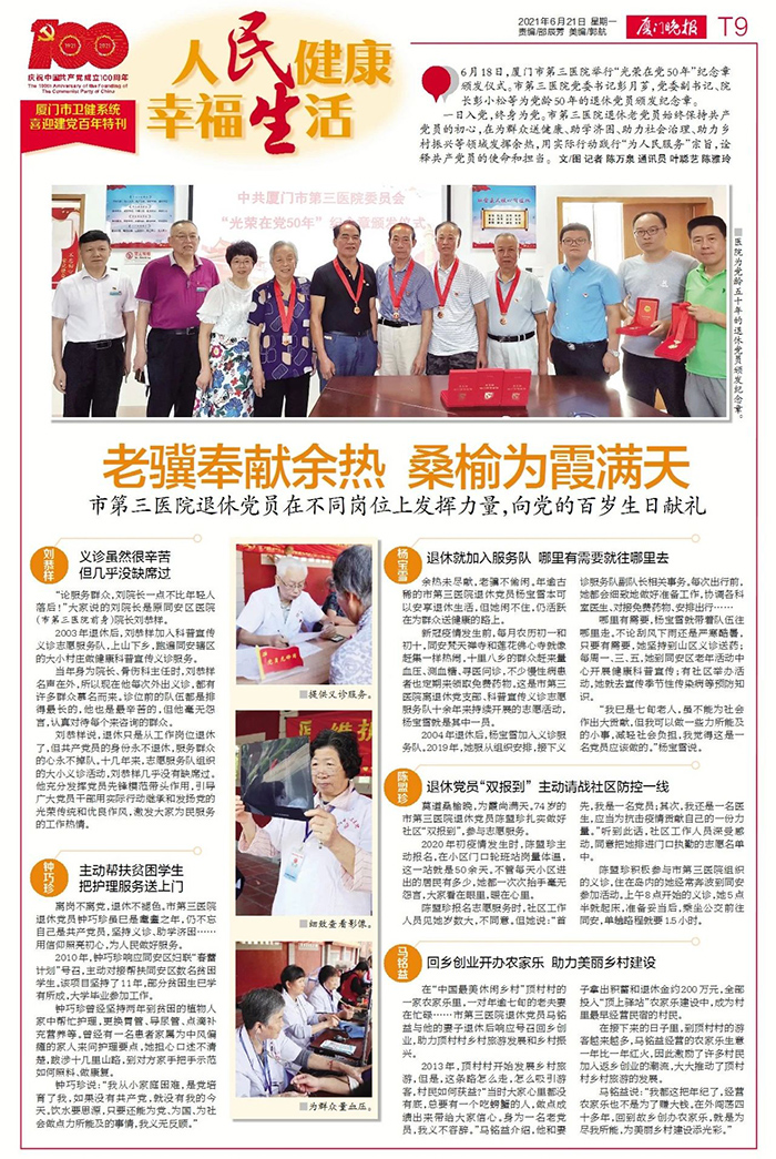 一日入党,终身为党。市第三医院退休老党员始终保持共产党员的初心,在为群众送健康、助学济困、助力社会治理、助力乡村振兴等领域发挥余热,用实际行动践行“为人民服务”宗旨,诠释共产党员的使命和担当。