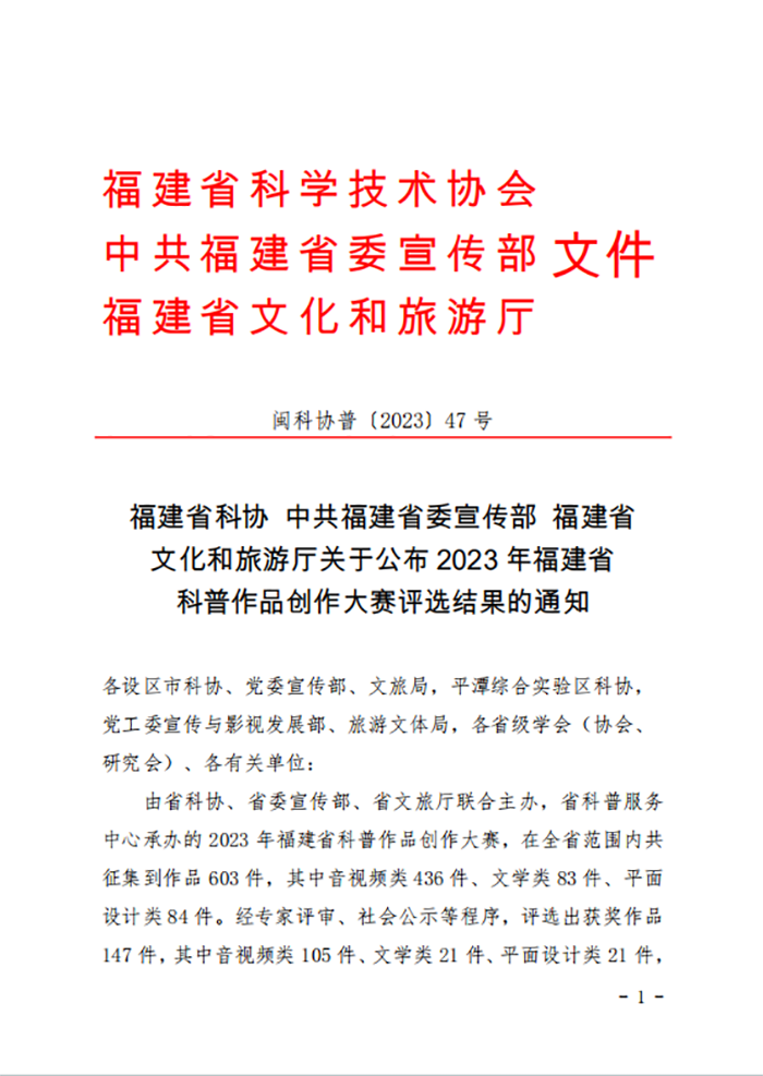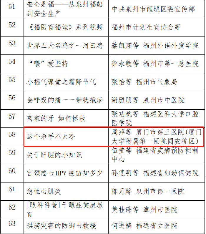 由省科协、省委宣传部、省文旅厅联合主办,省科普服务中心承办的2023年福建省科普作品创作大赛落下帷幕。经专家评审、社会公示等程序,我院重症医学科周萍、高素华、叶华光作品《这个杀手不太冷》荣获三等奖。