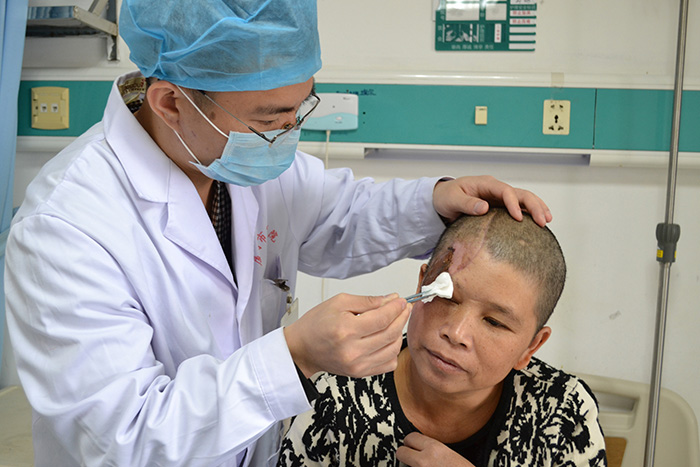 事故发生后,阿真被紧急送往第三医院。经过仔细检查,阿真头面部不仅皮肤撕脱严重、右手骨折,而且太阳穴处有一个拳头大的皮肤缺失,伤口污染严重。尽管入院后医生马上为阿真彻底清洗伤口、清除坏死组织,但是由于猪粪的感染,她的头部伤口开始流出脓液。