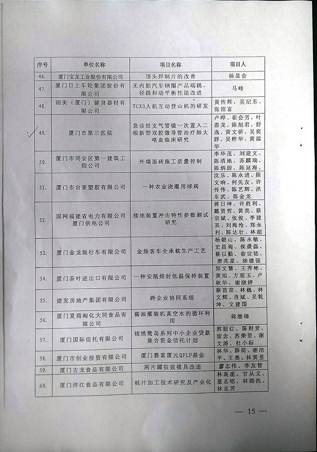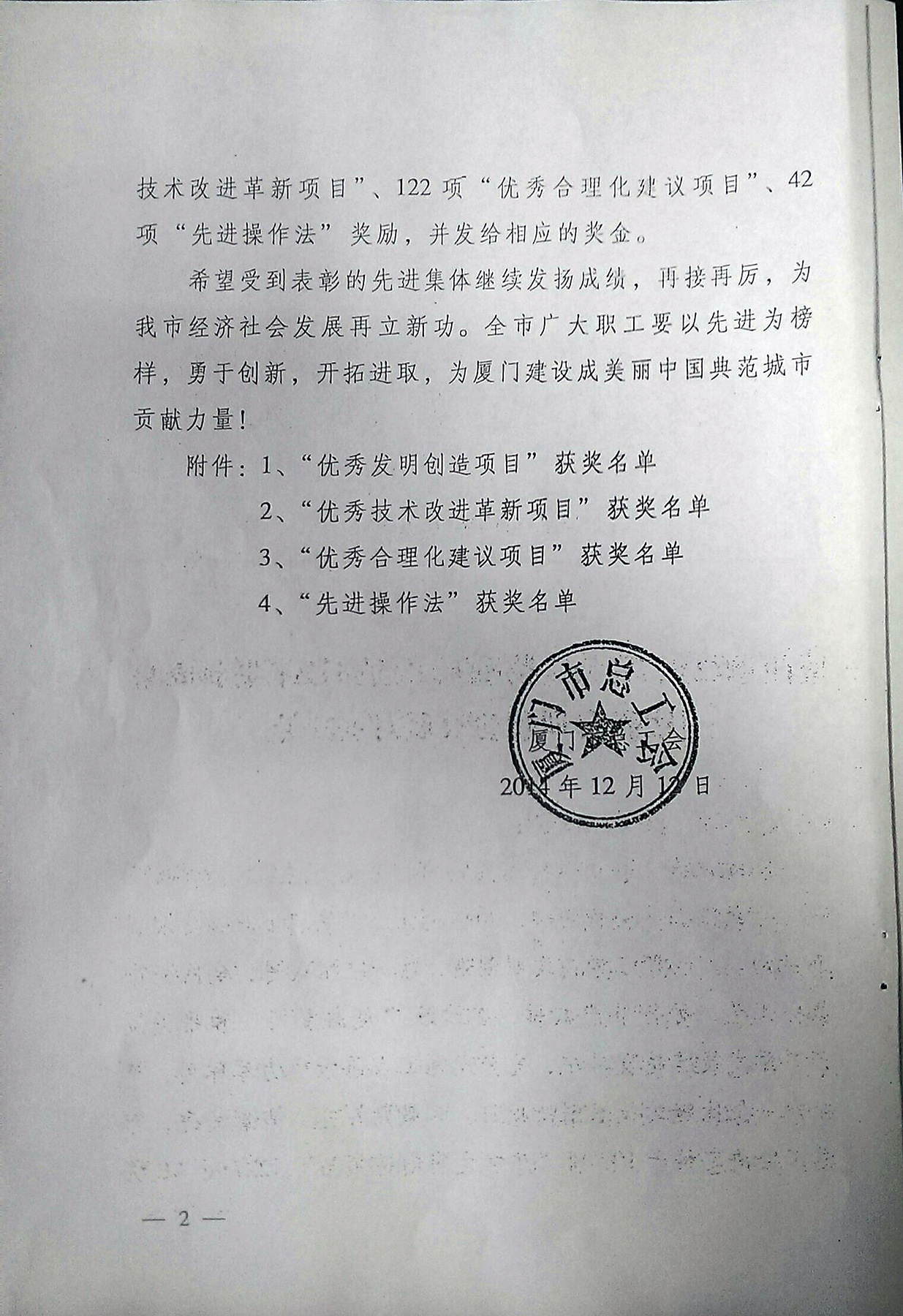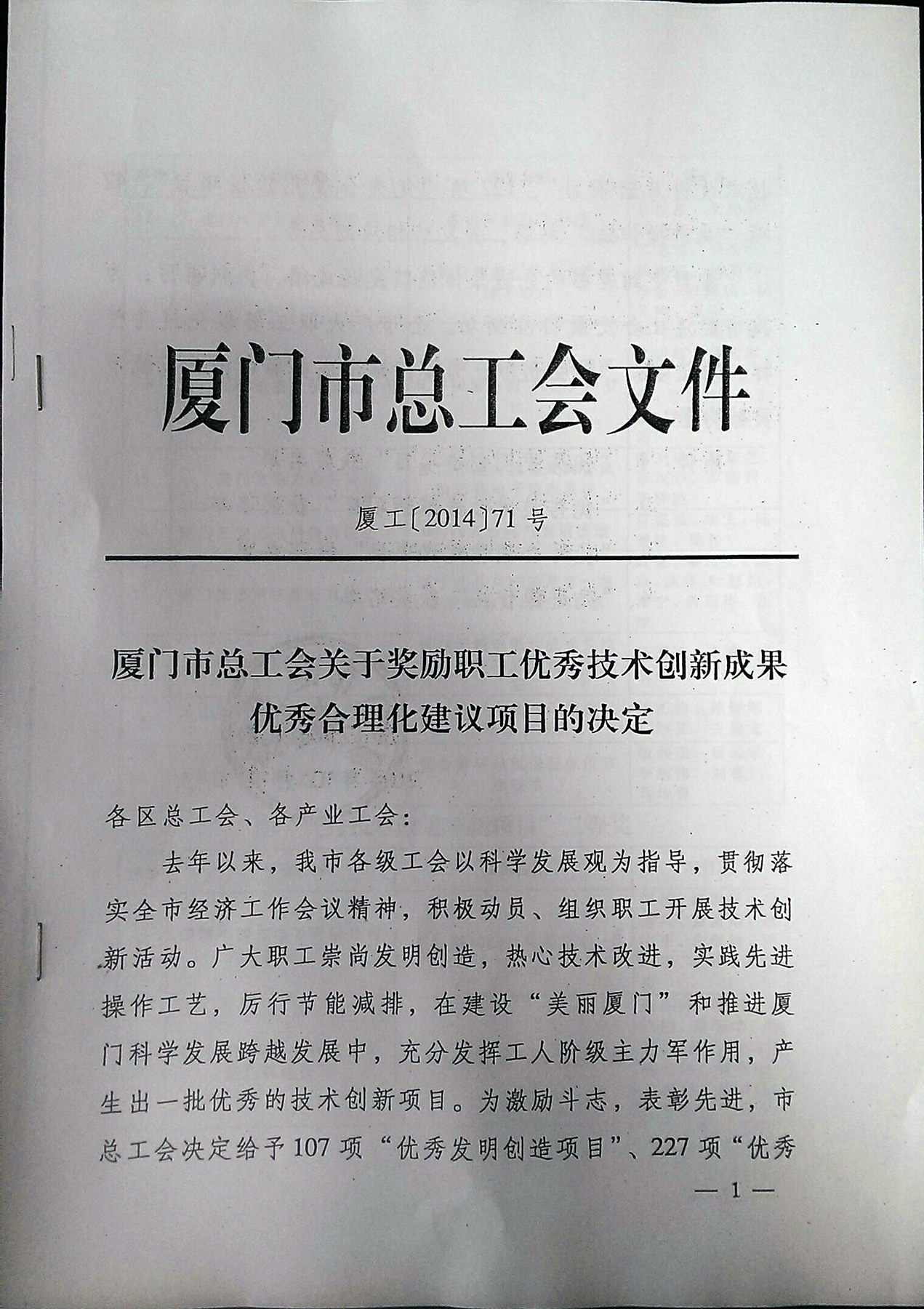 我院呼吸二科申报的“急诊经支气管镜一次置入二根新型双腔微导管治疗肺大咯血临床研究”项目被厦门市总工会授予“优秀技术改进革新项目”二等奖。