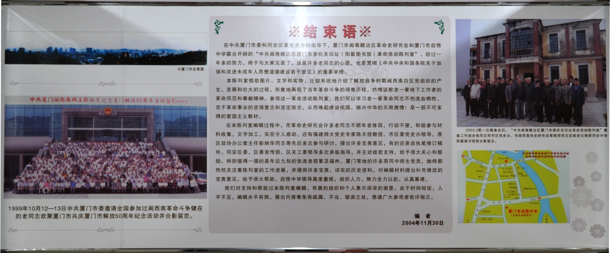 9月1日,在区卫计委党工委组织下,市第三医院领导班子到中共闽南地委厦门市工委革命旧址(在同安启悟中学校内)参观了中共闽南地委厦门市工委革命活动图文展,接受革命教育,弘扬爱国主义精神。