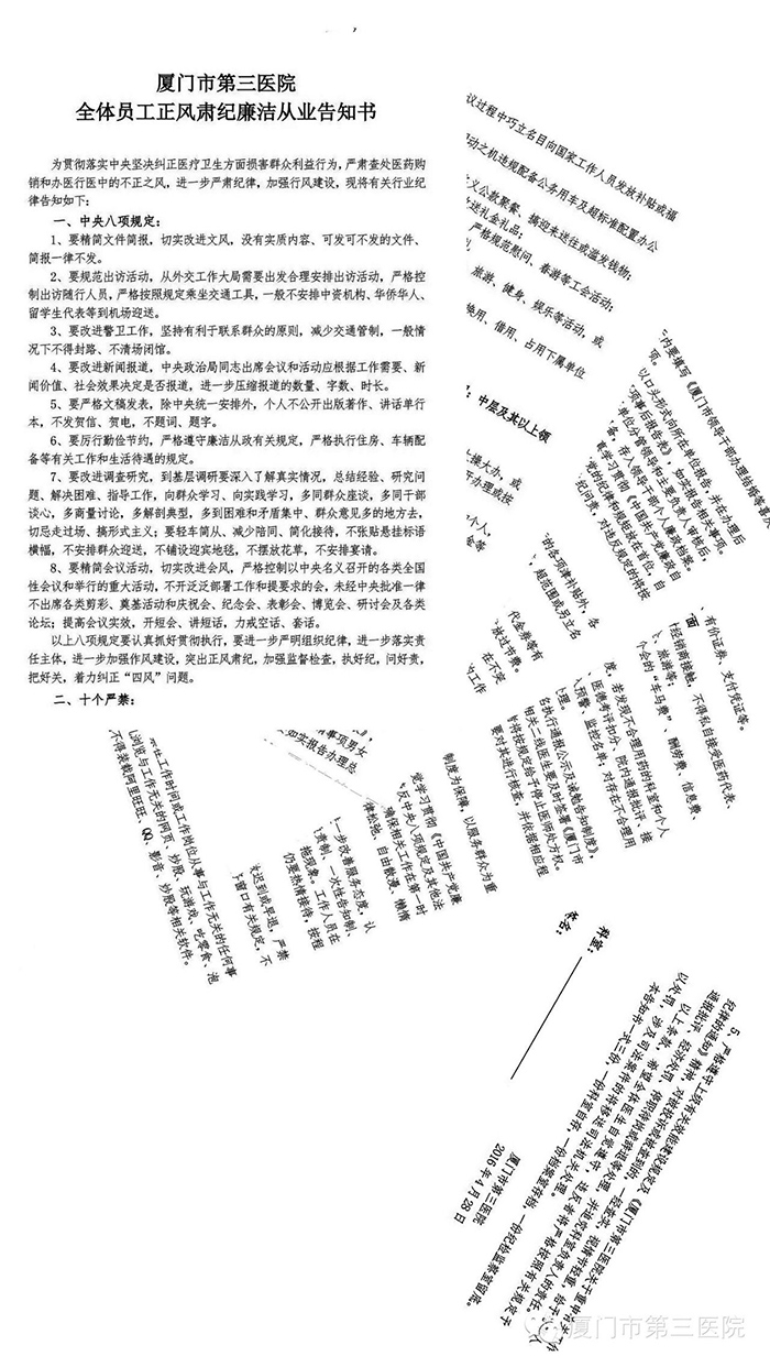 除及时召开相关会议进行传达贯彻,市三院还通过加强药品双十监测工作、加强辅助药品的用量控制、落实不当处方院内公示和处方点评制度、对药品双十排名前三位的前十名医生及二线医生进行诫勉谈话、与参与新一轮药品招标工作的人员签署廉洁承诺书、与全体职工签署正风肃纪廉洁从业告知书等措施,对医务人员敲响警钟,规范诊疗行为, 降低医疗费用,进一步促进阳光用药,做到合理用药,有效控制药品比例,既保证临床用药,又减轻患者经济负担。