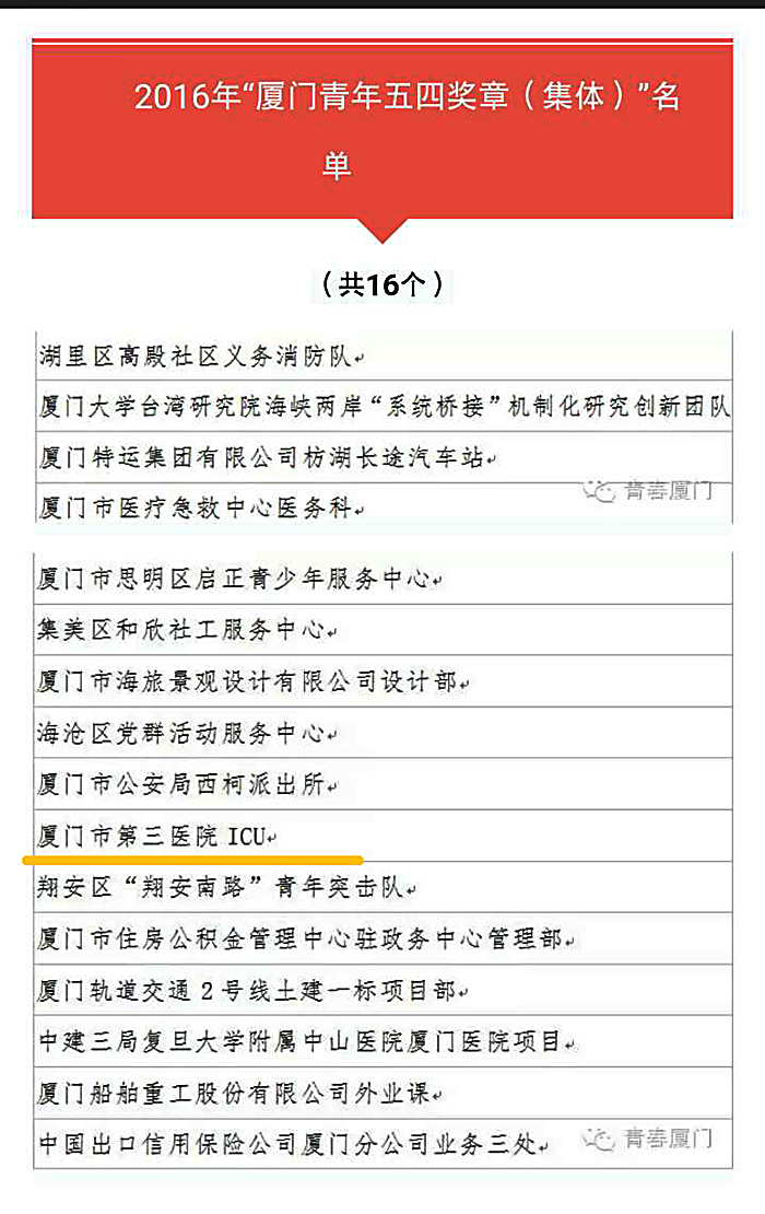 我院ICU喜获“厦门青年五四奖章”集体殊荣