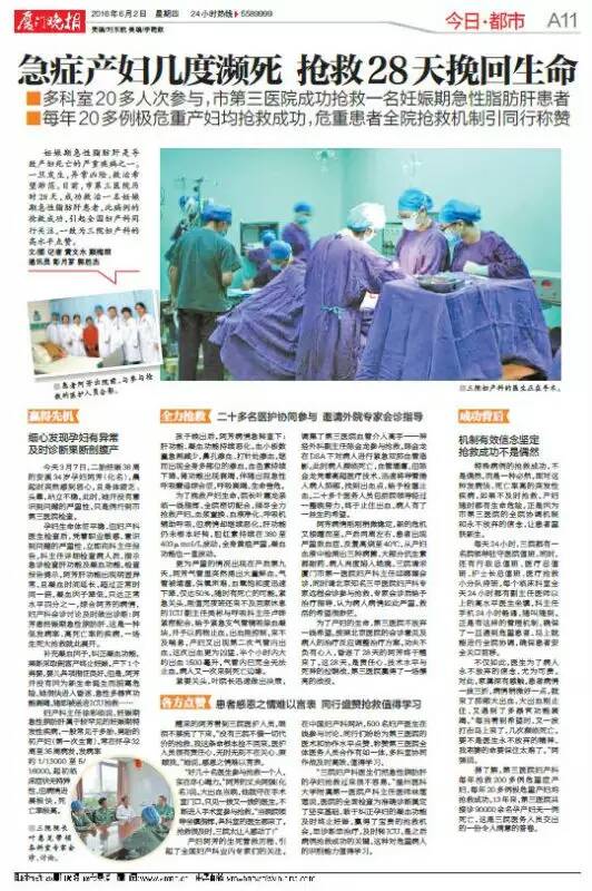特殊病例的抢救成功,不是偶然的,而是一种必然。面对这种发病快、死亡率高的突发性疾病,如果不及时抢救,产妇随时都有生命危险。正是因为市第三医院的全院协调机制和永不放弃的信念,让患者重获新生。每天24小时,三院都有一位院领导驻守医院值班,同时,还有行政总值班、医疗总值班、护士长总值班、医疗抢救小分队待班。每个临床科室全天24小时都有副主任医师以上的高水平医生坐镇,科主任手机24小时畅通,随叫随到。正是有这样的管理机制,确保了一旦遇到危重患者,马上就能进行全院协调,确保患者安全关口前移。不仅如此,医生为了病人,永不放弃的信念,尤为可贵。阿芳的病情一波三折,病情稍微好一点,就来了肺部大出血,大出血刚止住,又遇到了多器官功能衰竭。“每看到一点希望时,又一波打击来了,几次濒临死亡,要不是医生永不放弃的精神,我老婆的命要保住太难了。”患者丈夫阿强说。