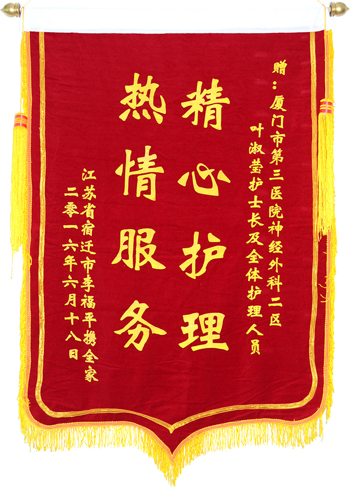 6月27日上午,快递给第三医院送来了一份特别的礼物,打开一看,原来是从江苏省宿迁市寄来的两面锦旗。其中一面锦旗是赠送给神经外科二区陈金龙主任、龙建武医生,称赞他们“医德高尚、医术精湛”,另一面赠送给叶淑莹护士长及全体护理人员,称赞她们“精心护理、热情服务”。