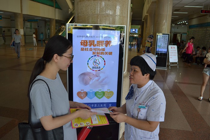 8月2日上午,外科党支部组织在职党员医务工作者在门诊大厅开展了“母乳喂养咨询”宣传周活动,妇产科派出4位高年资、拥有丰富经验的党员医务人员为孕妇及哺乳期妈妈就母乳喂养知识、技能、技巧及注意事项进行现场指导,对孕妇及哺乳期妈妈关于母乳喂养方面的疑问进行现场解答,并发放“母乳喂养宣传册”200余册,手把手指导新生儿护理等,向群众传递坚持母乳喂养的信念和科学知识。活动现场人头攒动,气氛热烈,有80多位孕妇及哺乳期妈妈进行咨询,第三医院党员医务人员认真、热情地解答了市民的疑问,获得孕妇及哺乳期妈妈的一致好评。
