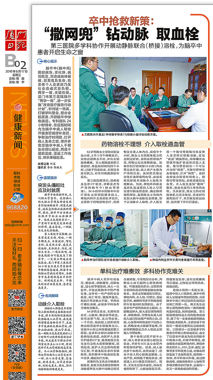 践行“两学一做”,进一步实施“改善医疗服务行动计划”,针对这一恶疾,打破学科壁垒,整合全院资源,开辟脑卒中绿色通道。专科团队24小时待命,在最短时间内为脑卒中病人取栓开通血管或修补血管,争取治疗时间窗,打开病人生命之窗,使许多危重脑卒中病人不但生命得以延续,而且不留后遗症,重返工作岗位,快乐幸福生活。