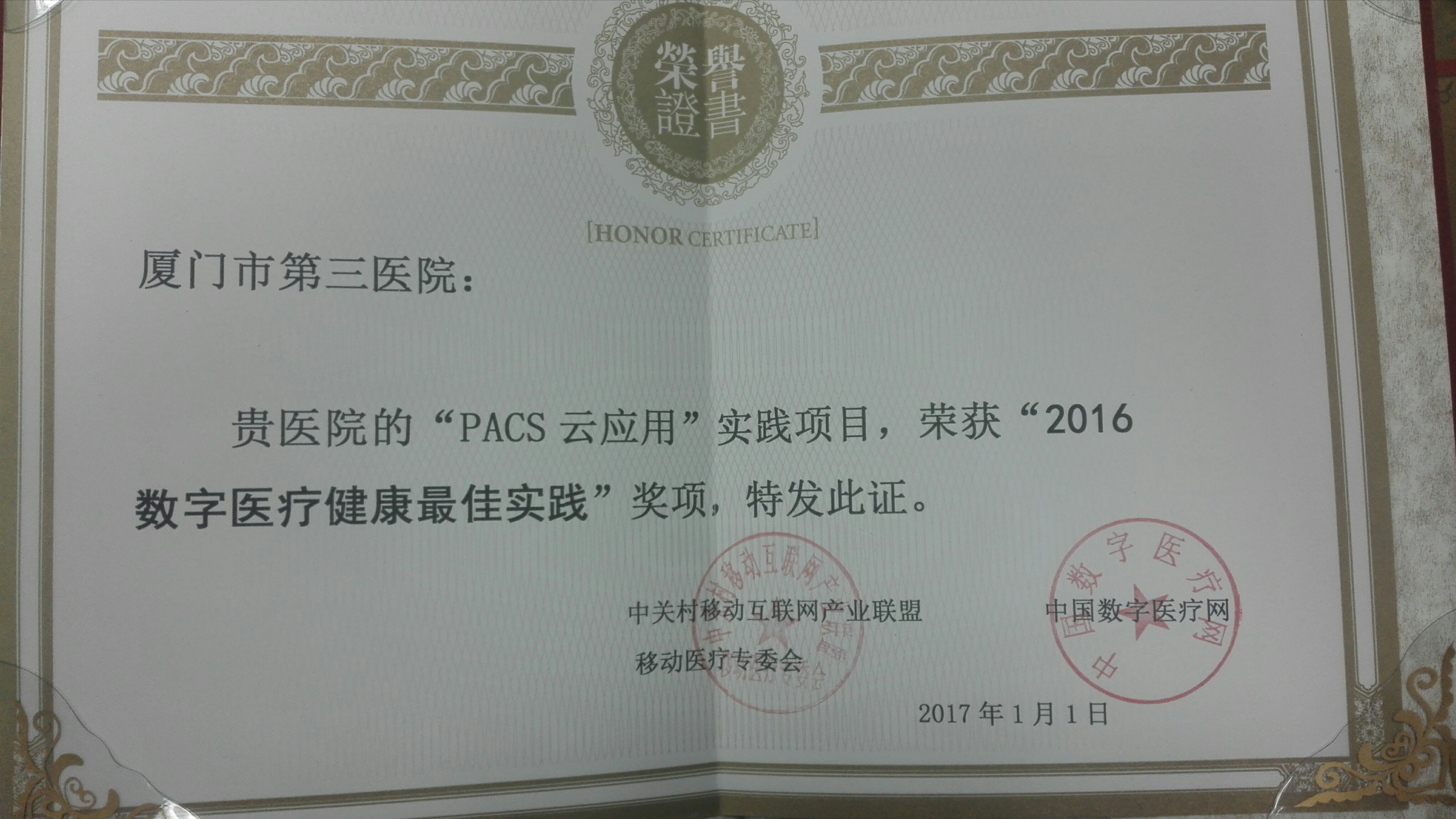 热烈祝贺我院PACS云应用实践项目荣获“2016数字医疗健康最佳实践”奖