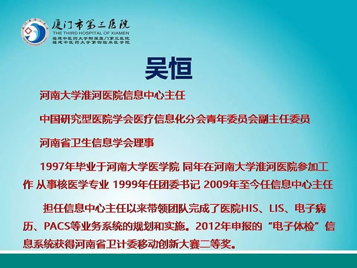 河南大学淮河医院信息中心吴恒主任分享了数字化医院评审与医院信息化建设经验,河南省把信息化建设作为等级医院评审的入门条件,这种作法值得借鉴。信息对医院的建设至关重要,尤其医联体的建设,要成立几大中心,包括区域心电中心、影像中心、物流中心、供应中心等,只有信息化的互联互通,才能确保政令畅通,起到事半功倍的效果。