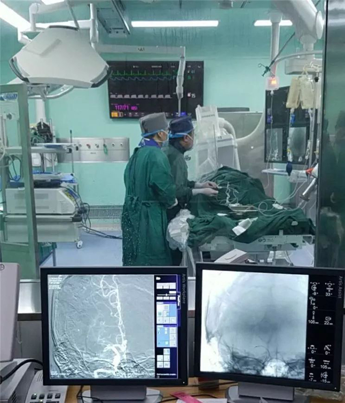 见状,医院立即启动脑卒中急救绿色通道,急行磁共振检查及脑血管造影确诊为脑部大血管栓塞,紧急给予静脉应用溶解血栓药物,并行血管内介入,经大腿部血管穿刺,把取栓支架经大腿部血管送到脑部血管栓塞处,用金属支架把堵住血管的血栓拉出体外。