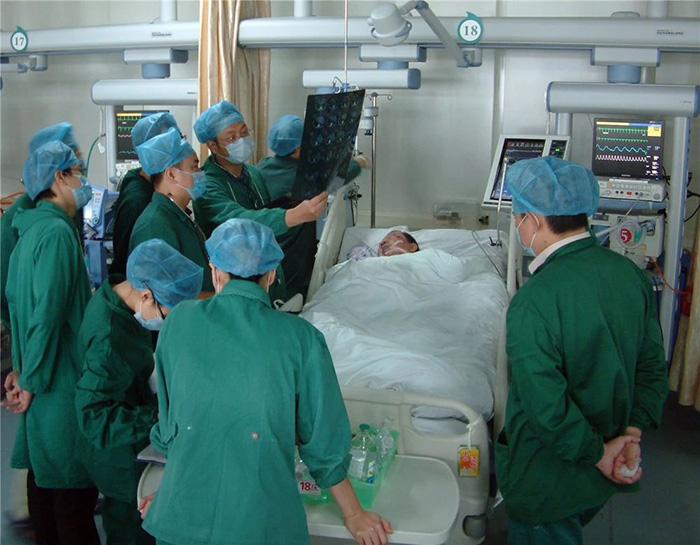 抢救。急诊科接到患者后,15分钟内胸外科、脑外科、骨科、ICU等MDT专家到位会诊,作出判断,在复合手术室里,各科室专家有条不紊协同开展工作。脑外科在头部开颅,ICU负责气管切开,骨科负责下肢支架固定,最后患者终于保住了性命,送ICU进行后续治疗。