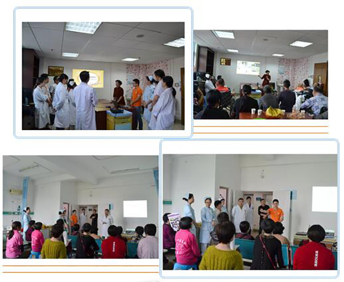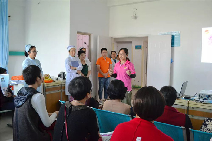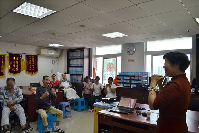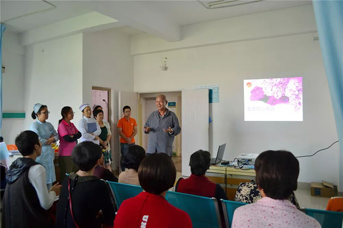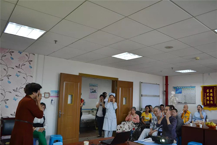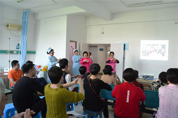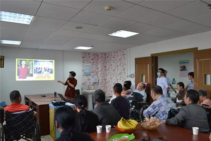 社工们分别走进三院康复科、肿瘤科,通过观看宣传影片、教授手语歌及肩颈运动等方式帮助患者疏导压力,舒缓情绪。吴培华讲师以《正向面对多样人生 重拾生活信心》为题,与患者座谈交流,抚慰患者心灵。三名曾罹患癌症的义工也以《健康快乐人生》为题,向大家分享自己的生命故事,引导患者及家属积极转化负面情绪,乐观面对疾病,树立治疗信心。