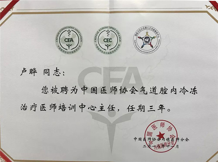 91club 荣获“中国医师协会气道腔内冷冻医疗医师培训中心”称号
