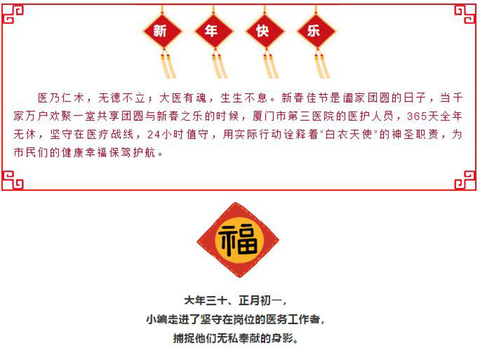 “多名怀孕的医护人员仍坚守岗位。”市第三医院急诊科主任王健说,每年春节假期,也是急诊科最不能松懈的时候,特别是天气冷暖不定,加上因情绪、饮食等方面的影响,急性心梗、心脏病、中风等突发急症病人增多,急诊科医护人员更得抓住抢救的黄金时机,展开生死营救。今年大年除夕,王健再次放弃和家人共享年夜饭的欢乐时光,24小时留守医院,“当我们将患者从死亡线上拉了回来,或者让一个重病患者转危为安时,是我们最兴奋的时候,所有的辛苦和努力都是值得的,因为我们挽救了一个又一个的家庭。”