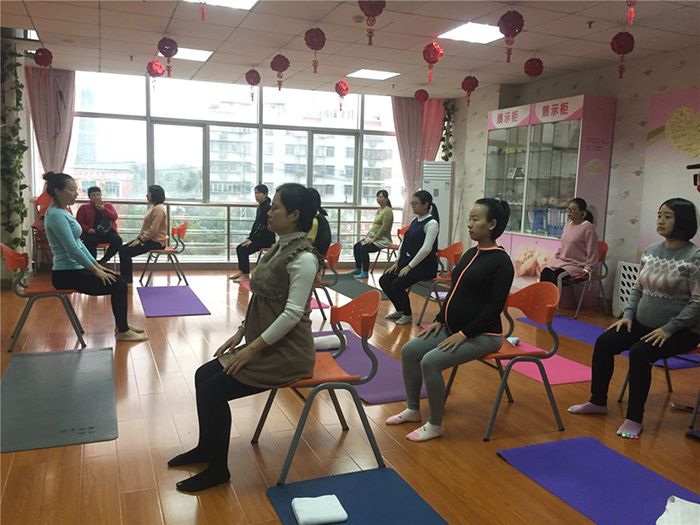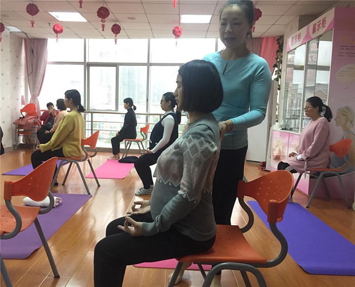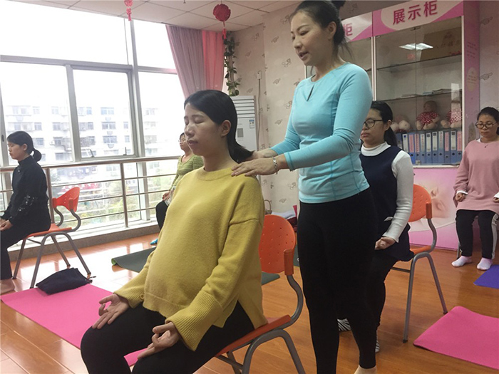 通过深呼吸等方法,孕妈们逐步放松心情,让心境逐渐回归至宁静平和的状态,随后在瑜伽老师的指导下,舒展动作,放松肌体。