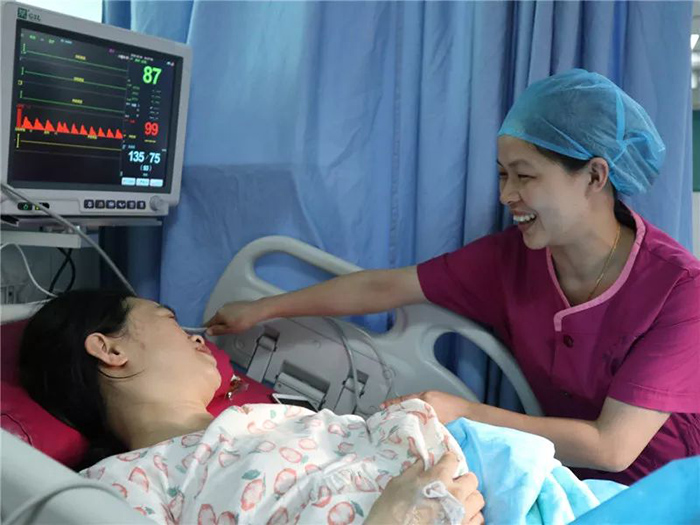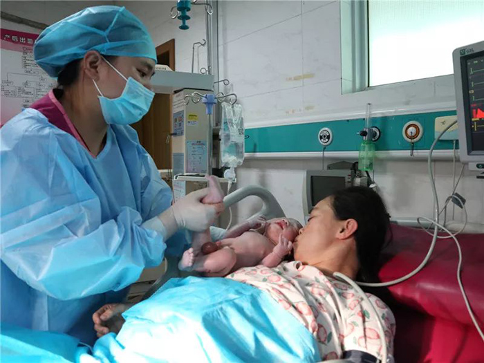 去年11月24日上午8点多,产妇梅子(化名)突发脐带脱垂,接诊助产士小李见状,立即戴上无菌手套,迅速爬上病床,双膝跪在床上,轻轻托起脐带,上推胎头避免脐带受压,并始终保持这种姿势直到宝宝娩出。同时,产科团队一组人员以最快速度将产妇及床上的助产士一起转运到产房手术间进行抢救,母子均安。两个月后,产妇梅子一家送来锦旗以表感谢,“三院妇产科有这么好的应急抢救能力,以后生二宝,一定还选你们。”