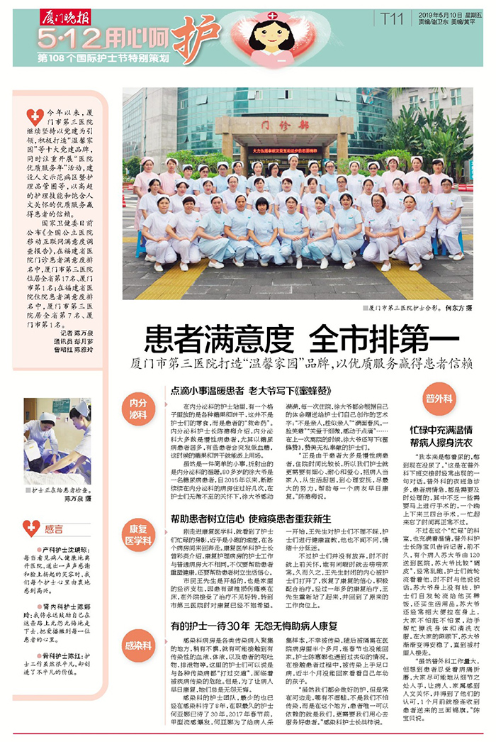 护理工作是一门精细的世术,用心做到最好,让痛苦的脸上重新绽放笑容,让一个个家庭都重现欢声笑语。