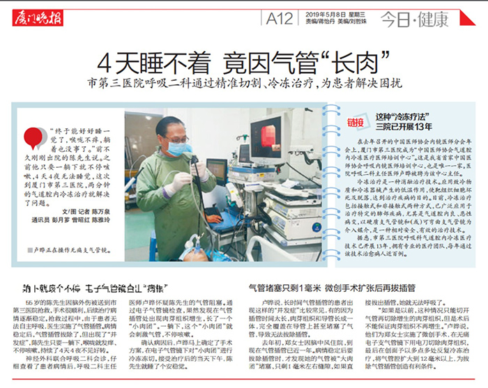 确认病因后,卢晔马上确定了手术方案,在电子气管镜下对“小肉团”进行冷冻冻切。接受治疗后的当天下午,陈先生就睡了个安稳觉。